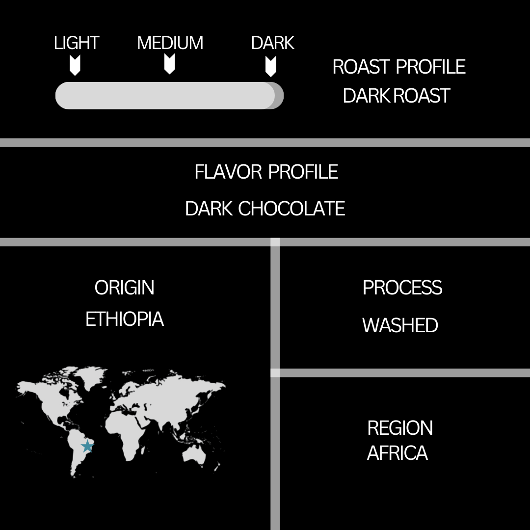 Our beans, a selection of the finest heirloom varieties, are grown at an altitude of 4,500–6,500 feet in the lush Ethiopian highlands. This region, known for its ideal climate and fertile soil, produces beans with complex flavor profiles. The traditional washed process enhances the beans’ natural brightness and fruit-forward notes, while the Italian roast intensifies the boldness and richness of each sip.
