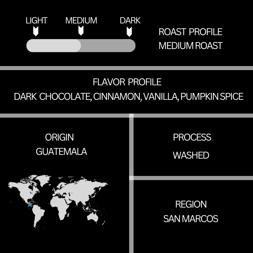 Our carefully selected beans are roasted to a smooth medium roast, allowing the natural coffee flavors to shine while balancing the bold, spiced notes. Infused with the inviting warmth of pumpkin spice, the creamy sweetness of vanilla, and a subtle kick of cinnamon, this blend offers a comforting and flavorful experience with every sip.