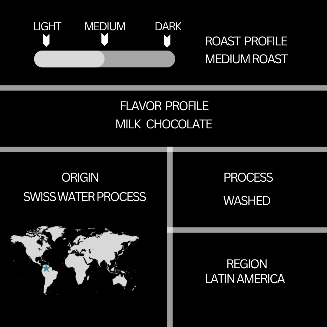 Our beans are carefully selected from the highlands of Latin America, where ideal growing conditions result in beans with a rich, complex flavor profile. The Swiss Water Process decaffeination method ensures that all the natural flavors are retained, offering a smooth and satisfying cup with none of the caffeine.