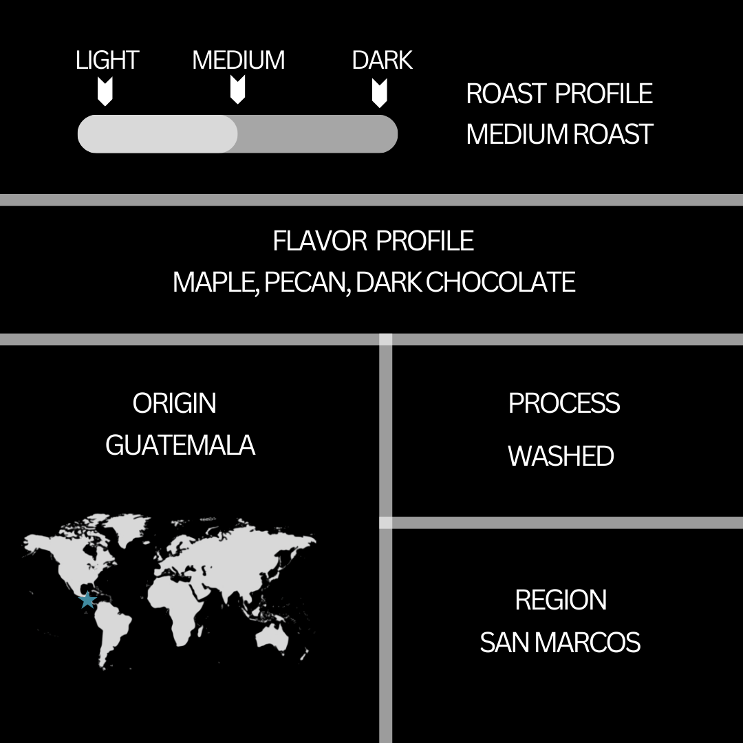 Our beans, grown in the fertile volcanic soils of Guatemala, are carefully selected for their bright and balanced flavor profile. The addition of toasted pecan and maple enhances the natural richness of the coffee, creating a delightful blend that balances the nutty, buttery notes of pecans with the subtle sweetness of maple syrup.
