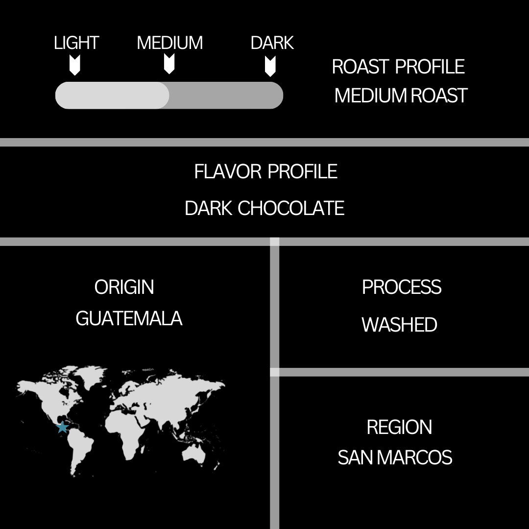 Our beans, a selection of premium Bourbon and Typica varietals, are cultivated at elevations of 4,000–6,000 feet in Guatemala’s fertile highlands. This altitude, along with the region’s unique climate and volcanic soil, creates beans with a distinctively bright, balanced flavor. Our washed process enhances the beans’ natural clarity and brightness, resulting in a clean and smooth cup.